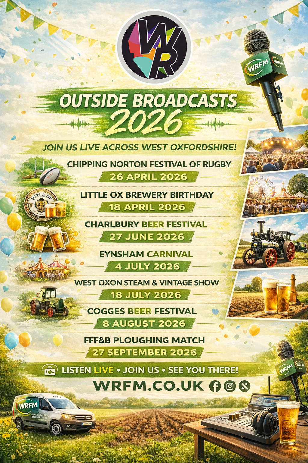 Our outside broadcasts bring local events, festivals, fundraisers and community initiatives directly to listeners across Oxfordshire and the Cotswolds From agricultural shows and music festivals to charity days, town celebrations and sporting events, WRFM is proud to be part of what makes our area special.